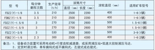 翻車機(jī)又名翻罐籠,其主要規(guī)格為:FDZ(B)Z(Y)-1(1.5)/6(9)。它是礦山和煤礦使用固定式礦車運(yùn)輸中轉(zhuǎn)的主要卸料設(shè)備,具有生產(chǎn)效率高、使用簡單、安全可靠等特點(diǎn)!