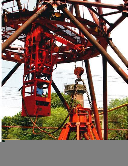 4.抓巖機(jī)下到井底后,使抓巖機(jī)靠在靠近抓巖機(jī)口處的模板上,確認(rèn)靠穩(wěn)后通知絞車(chē)司機(jī)準(zhǔn)備奪鉤,下放抓巖機(jī)懸吊鋼絲繩,作業(yè)人員把懸吊鋼絲繩掛在抓巖機(jī)上進(jìn)行奪鉤。