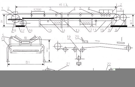 1、傳動滾筒;2、頭罩;3、輸送帶;4、槽型調(diào)心托輥;5、槽型托輥;6、緩沖托輥;7、導料槽;8、螺旋拉緊裝置;9、改向滾筒;10、尾架;11、空段清掃器;12、下平調(diào)心托輥;13、下托輥;14、中間架;15、中間支腿;16、改向滾筒;17、頭架;18、彈簧清掃器;19、垂直拉緊裝置;20、犁式卸料器;21、卸料車;22、車式拉緊裝置