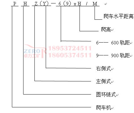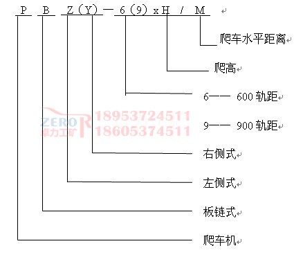 液壓鏈?zhǔn)脚儡嚈C(jī)用于600軌距1t、1.5t及900軌距1.5t、3t礦車向上爬高,根據(jù)爬高不同共有14種型號,每種又根據(jù)傳動裝置布置方式不同分為左側(cè)式與右側(cè)式。