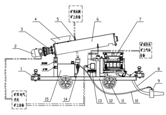 1、碰頭 2、電動(dòng)機(jī) 3、減速機(jī) 4、進(jìn)料斗 5、進(jìn)水管路 6、攪拌機(jī) 7、噴射機(jī) 8、輸料管 9、噴頭10、輸液膠管 11、礦車(chē)輪對(duì) 12、車(chē)架 13、電動(dòng)機(jī) 14、速凝劑泵 15、速凝劑箱